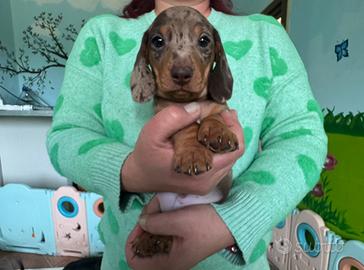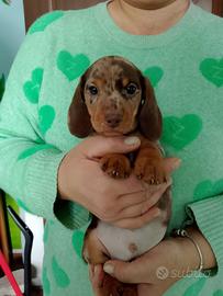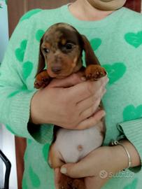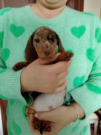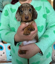 BELLISSIMI cuccioli di bassotto a pelo corto arlecchino cioccolato disponibili per amorevoli famiglie.I piccoli sono due maschietti nati e cresciuti in ambiente familiare con le massime cure ed attenzioni e verranno ceduti con prime vaccinazioni, trattamenti sanitari effettuati, microchip con relativa iscrizione all'anagrafe canina, pedigree Enci e kit cuccioli. Alta genealogia.Informazioni solo telefonicamente al 3394111274 grazie