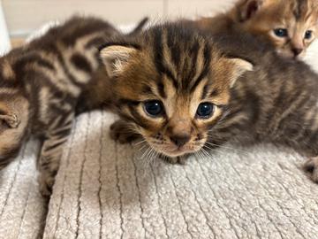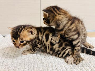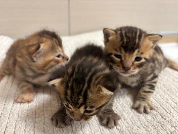 3 cuccioli : 2 femmine e 1 maschio nati il 15 novembre da un incrocio tra un Bengala e un gatto Europeo. Vivono in famiglia quindi con carattere docile ed affettuoso.