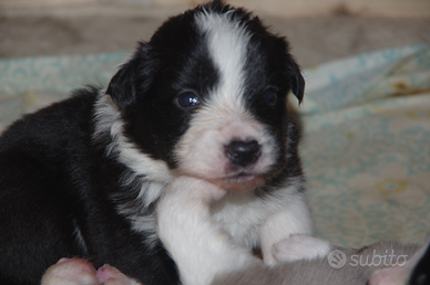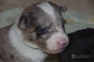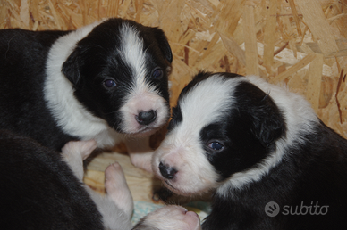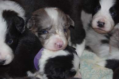 Vendesi cuccioli di border collie nati il 28 novembre da stallone Lanny Zeus manto blu merle e fattrice India Zuma manto bianco nero provenienti dall allevamento Casa Sunrice di Pontedera.