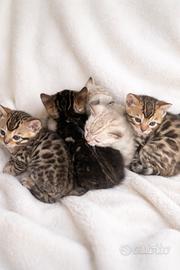 Cuccioli di Bengala disponibili al compimento di due mesi e mezzo. Entrambi i genitori visibili sul posto e in foto Disponibili splendidi cuccioli di gatto Bengala, nati da genitori visibili e provenienti da allevamenti riconosciuti. I cuccioli sono nati a inizio marzo e fanno parte di una cucciolata di 6 piccoli, di cui 3 già prenotati. Attualmente disponibili: o 1 femmina White (mantello chiaro, rara e molto particolare) - €800 o 1 femmina Brown leopardata (il mantello più classico e ricercato del Bengala) - €700 o 1 maschio Marble (mantello marmorizzato/tigrato) - €600 Tutti i cuccioli sono fratelli della stessa cucciolata e verranno ceduti con: o libretto veterinario o visita veterinaria o vaccinazione o sverminazione o trattamento antiparassitario Saranno ceduti solo al compimento dei due mesi e mezzo , quindi non prima di metà Maggio , nel pieno rispetto dei loro tempi di crescita, salute ed educazione. Ritengo infatti molto importante che i cuccioli restino con la madre e con i fratellini nei primi mesi di vita, così da sviluppare correttamente comportamento, equilibrio e socializzazione. Per il momento sono visionabili e prenotabili. Contattare 3519025628