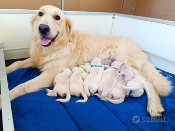 Splendidi cuccioli di Golden Retriever di linea inglese nati il 14 settembre 2025, disponibili gli ultimi due maschietti, genitori selezionati e controllati per le patologie di razza, test genetici eseguiti con MyDog DNA, lastre ufficiali entrambi A/0, deposito campione biologico Vetogene, visita oculistica ed ecocuore.