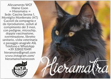 Allevamento "Hieramatra" con Affisso WCF propone bellissimi cuccioli di maine coon, maschi di vari manti. Pronti dal 16/06/2026. Genitori di nostra proprietà e visibili in sede. I nostri gattini vengono ceduti al compimento dei tre mesi, con Pedigree AGI (riconosciuto dal MASAF) + microchip + doppia vaccinazione + sverminazione + libretto sanitario + passaggio di proprietà + un omaggio di cibo e giochi Entrambi i genitori sono negativi FIV/FeLV (rilasciamo la copia del test eseguito dal veterinario) + negativi ai test genetici per le patologie più comuni: Miocardiopatia ipertrofica (gene MYBPC3), Atrofia progressiva della retina (gene KIF3B), Degenerazione tardiva dei fotorecettori, Malattia renale policistica, Miotonia congenita, Disgenesia cerebrale, Mucopolisaccaridosi, Deficit di diidropirimidinasi, Malattia di Niemann-Pick, Amaurosi congenita di Leber, Porfiria intermittente acuta (rilasciamo la copia del laboratorio) Richiesta: 1300 euro con Pedigree aperto in opzione svincolata "for breeding" (nessun vincolo, di nessun tipo). Sconto a 1000 euro se da compagnia con sterilizzazione. Possibilità di rateizzazione in attesa della consegna. Ci troviamo a Montiglio Monferrato (AT). Possibilità di portare a mano in Piemonte, anche a domicilio, oppure di spedire fuori regione col Corriere di animali vivi autorizzato, anche se preferiamo conoscerci. Contattateci senza impegno, anche per vederli in sede :) Telefono e WhatsApp +39 3280270491. Grazie