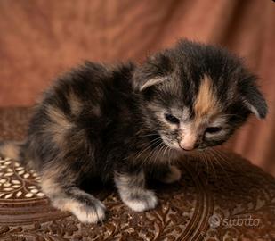 Allevamento con affisso, situato a Perugia, è lieto di annunciare la possibilità di prenotare fantastici cuccioli di Maine Coon, linea russa, con pedigree AGI. I cuccioli, nati il due aprile, sono due maschietti cream e blue solid e quattro femminucce tortie. Al momento della cessione (90 giorni dalla nascita) i cuccioli avranno libretto sanitario con doppia vaccinazione e trattamento vermifugo, microchip, principali test genetici ( SMA, PKDef, HCM) ed ecocardio i dei genitori negativi, regolare contratto di cessione e pedigree AGI. Prezzo: 1200 euro per i maschietti , 1000 per le femminucce con pedigree da compagnia. Si valuta anche cessione da riproduzione con prezzi ovviamente diversi. Gradita piccola presentazione, contattateci per qualsiasi info, saremo lieti di rispondere!