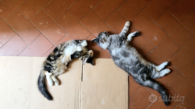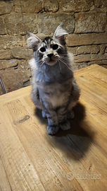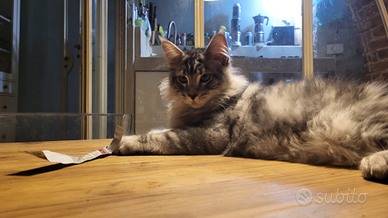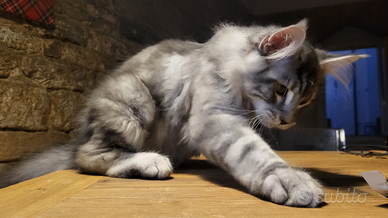 Ultimo maschio black silver tabby di razza Maine Coon rimasto (solo perché avevo pensato di tenerlo con me) compirà 4 mesi il 28 maggio. Di grandi dimensioni (basta compararlo con la sorella nella foto). Viene ceduto vaccinato con pedigree wcf da riproduzione e microchip.