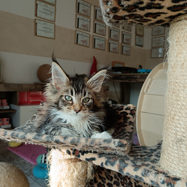 Cucciolo maschio di Maine Coon, colore black tabby ticked & White, età 3 mesi verrà ceduto con pedigree libretto sanitario con doppia vaccinazione sverminazione e antiparassitario, visita veterinaria prevendita con certificato di buona salute, contratto di cessione, passaggio di proprietà, kit di benvenuto con prime pappe e giochi, test dei genitori tutti negativi per hcm, hcm A31, pk def, pkd. Atrofia spinale muscolare, atrofia retinica, elettrocardiogramma. Il cucciolo è pulito, curioso giocherellone e socievole abituato alla lettiera e tiragraffi.