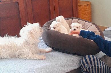 Splendidi batuffoli bianchi nati il 1 marzo in casa dalla maltesina di nostra proprietà di 3.5kg (visibile) maschio maltese della zona con peegree. Verranno ceduti sverminati, vaccinati e con microchip al compimento dei 60 gg. disponibili 1 maschio. Se veramente interessati potete contattarmi anche telefonicamente. No staffette, no curiosi, se non troppo distanti disponibili a portarvelo. La cucciolata é il frutto del desiderio della loro padroncina (mia figlia) di vivere questa meravigliosa esperienza con la sua fedele compagna di giochi e coccole.