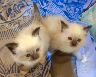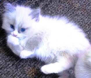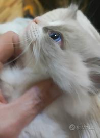 Verranno ceduti da metà aprile. Genitori con pedigree, testati ed esenti da malattie genetiche tipiche dei felini, testati fiv e felv negativi. I cuccioli sono nipoti di campioni internazionali di bellezza; verranno ceduti senza pedigree, con doppia sverminazione e prima vaccinazione trivalente, libretto sanitario e certificato di buona salute. Il costo di cessione parte da 550 euro e può arrivare a 750 euro in funzione del cucciolo, della sua più o meno rispondenza ai canoni di bellezza della razza. Disponibili anche cuccioli con pedigree se richiesto. Il carattere dei Ragdoll è di una dolcezza senza paragoni nel mondo felino, sono ideali per i bambini e per la pet terapy, i nostri gatti vengono allevati in casa, a stretto contatto con le persone, in modo da aumentare l'imprinting.