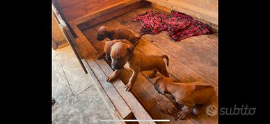 Disponibili cuccioli dí Rhodesian Ridgeback alta genealogia con pedigree. Genitori e cuccioli nelle foto, ma assolutamente visionabili. Nati il 2 maggio verranno consegnati subito dopo lo svezzamento (circa 70/80 gg) con vaccinazione, sverminazione, microcippati e pedigree. Il Rhodesian è un cane molto equilibrato che convive benissimo con la famiglia e nello specifico con i bambini. Essendo una razza africana originariamente a protezione e sorveglianza di animali feroci, tra questi il leone, ha una propensione spiccata alla guardia e protezione del proprio territorio.