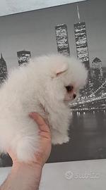 Disponibili cuccioli di spitz pomerania total white di 2 mesi. I piccoli vengono ceduti: gia abituati all'uso della traversina, svezzati con royal canin mini starter, sverminati, vaccinati, microchippati, con attestato di buona salute libretto sanitario e pedigree ENCI. Entrambi genitori con pedigree ENCI e deposito del DNA entrambi di mia proprieta e visibili insieme ai cuccioli. (NON CEDO A RIVENDITORI) solo famiglie private e amanti di animali. Per info e prenotazioni mi potete contattare su whattsapp. Si prega di contattare solo persone decise e seriamente interessate no speculatori no perdite di tempo grazie!!!