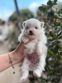 Disponibili alla prenotazione cuccioli di spitz tedesco nano detto anche Pomerania. Maschio bianco Maschio orange Genitori visibili entrambe con pedigree enci, i cuccioli sono abituati all'uso della traversina e sono nati e cresciuti in casa con cura e amore ,verranno ceduti con: Due vaccini Esame feci Libretto sanitario Certificato di buona salute Iscrizione anagrafe canina Microchip Pedigree Enci Contattare se interessati al 3209351048. Possibilità di consegna in tutta italia.