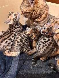 Disponibili alla prenotazione cuccioli bengala nati il 27 febbraio e pronti per le nuove famiglie per maggio ; vengono rilasciati con Pedigree, Microchip , due vaccinazioni e sverminazione ed un kit cucciolo. Genitori testati ed esenti da patologie genetiche di razza. Rimasti disponibili due maschietti.