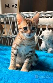 brown spotted,charcoal,snow .Genitori approvati riproduttori Wcf,Tica Anfi Fife.(quindi cuccioli muniti di pedigree)Cedesi a 90 giorni come previsto da legge, con vaccini ,sverminazioni,test genetici uso lettiera e tiragraffi .I cuccioli nascono in casa liberi senza gabbie o teche e sviluppano subito attitudine ad accordarsi con altri gatti e cani. Astenersi perditempo .gradito contatto telefonico o whatsapp.