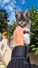 Ultimi due cuccioli rimasti di una litter di 7 tra fratelli e sorelle. Maschietto black silver ticked tabby green eyes. Femminuccia blue silver ticked tabby. Caratteristiche straordinarie!! I cuccioli non hanno nemmeno due mesi saranno pronti ad andare nelle nuove famiglie la seconda settimana di maggio! _____________________________________ Siamo un allevamento prestigioso, che fa linee di altissima genealogia sicuramente non semplici da reperire!... Da molti anni, abbiamo la passione, la grande conoscenza e amore per quella che riteniamo sia la vera razza maine coon, collaborando con i migliori allevamenti al mondo per la selezione assoluta delle top linee genetiche esistenti.Provenienze Russe,Norvegesi,Coreane,siamo specializzati nei manti silver in tutte le sue scale e sfaccettature fino al colore shaded, chinchilla e dominant blue eyes.I genitori,tutti visibili in allevamento e i nostri cuccioli sono di reale altissima genealogia , super types e vera stazza che contraddistingue questa razza.Crescono in un ambiente familiare in casa e con tutto l'amore che meritano,adattandosi così da subito alle nuove famiglie, ai rumori quotidiani e ai bambini ed animali che già la compongono.Ceduti solo ed esclusivamente dopo il 90 esimo giorno di età,vengono consegnati con : contratto legale da compagnia ,pedigree , libretto sanitario completo, sverminazione ,doppia vaccinazione, certificato veterinario attestante la buona salute, tutti i test genetici HCM,H1,Sma,Pkdef, e determinazione del gruppo sanguigno rigorosamente (N/N).Completano il corredo ecocardi aggiornati dei genitori.I piccoli saranno già abituati alla lettiera di carattere docilissimo sapranno integrarsi perfettamente in quella che diventerà la loro nuova casa. Per qualunque info non esitate a contattarci. Tutte le foto sono puramente indicative di svariati nostri soggetti come esempi esplicativi delle grandissime caratteristiche e colori!