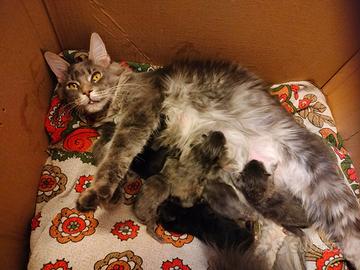 Nati il 25 marzo stupendi cuccioli Maine coon :due silver tortie diluito,due neri solido,e tre Blue silver ticked come la madre(con pedigree)padre Maine coon tabby rosso .cercano famiglia affettuosa Adatto a bambini il Maine coon è un gatto molto socievole giocherellone,chiacchierone,adora l'acqua può essere abituato gradatamente a pettorina guinzaglio per uscire ,docili e disponibili con indole simil canina