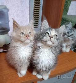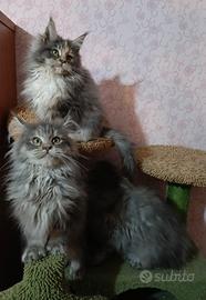 Disponibili a partire da fine Novembre presso allevamento amatoriale con affisso, cuccioli maschi e femmine di Maine coon di diverse età e colorazioni (Red silver, black silver, tortie, blu, blu crema, crema, black tabby) tutti con pedigree, nati da genitori HCM N/N ed esenti fiv e felv. Vengono ceduti sverminati, visitati, con libretto sanitario, vaccinazioni, pedigree e contratto di cessione da compagnia o da riproduzione.
