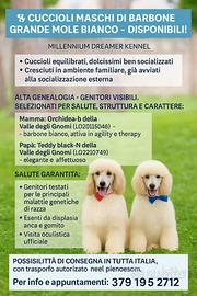 ? Nati il 21 aprile 2025 - Millennium Dreamer Kennel presenta due meravigliosi cuccioli maschi di Barbone Grande Mole Bianco, cresciuti con amore, competenza e nel pieno rispetto del loro benessere.