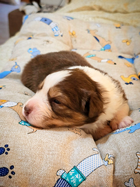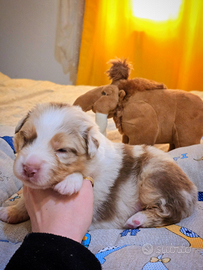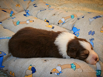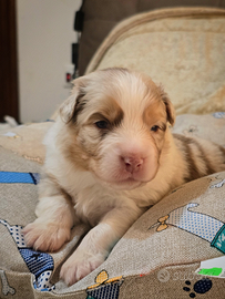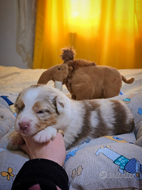Disponibili alla prenotazione 2 cuccioli maschi, un rosso tricolore e un red merle coda corta naturale di pastore australiano con pedigree ENCI/FCI.
