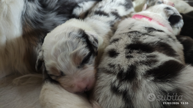 Cuccioli di pastore australiano nati il 06/02. Verranno consegnati dopo i 60 giorni di vita, con due sverminazioni, vaccino, libretto sanitario e certificato di stato di buona salute. Abituati all' uso del tappetino e svezzati. I cuccioli crescono in ambiente familiare con bambini, altri cani e cavalli.