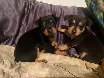 Vendesi bellissimi e dolcissimi cuccioli di cane pincher. Colorazione prevalente nera con sfumature marroni .Razza pura. Taglia piccola. Sono femminucce. Compiranno due mesi il 9 febbraio. Allevate amorevolmente in casa, abituate a bambini e altri animali. Godono di ottima salute e sobo state sverminate. Genitori visibili.