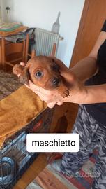 Bellissimi cuccioli di pinscher nano color rosso cervo, alta genealogia, cercano casa al compimento di due mesi e mezzo. Carattere dolcissimo, molto affettuosi, giocherelloni e vivaci. Verranno ceduti nel weekend del 30/31 maggio con visita veterinaria, prima vaccinazione, sverminazione e microchip. Possibilmente persone amanti della razza o che già conoscano il carattere.