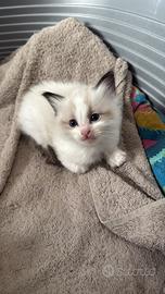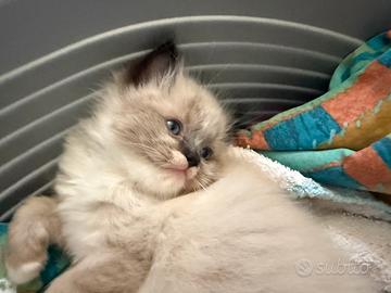 L'allevamento amatoriale LUNA CELESTE riconosciuto e certificato FIAF alleva con passione e tanto amore gatti RAGDOLL noti per il loro carattere straordinariamente dolce, adatti sia ai bambini che alle persone anziane. Questa razza viene spesso utilizzata per la pet therapy. I nostri cuccioli crescono in famiglia, liberi per la casa, perfettamente socializzati, ottimo imprinting anche con i cani. Verranno ceduti svezzati, abituati alla lettiera e al tiragraffi. Il 18/02/2026 sono nati 5 splendidi cuccioli, tre femmine e due maschi da NICE (Seal Colourpoint Bicolour)e MAVERICK (Lilac Mitted Colourpoint). Genitori visibili ed esenti da malattie tipiche della razza. PG Freee. Disponibili due femmine Seal point bicolour e un maschio Seal point mitted. I cuccioli presentano una buona struttura fisica, bellissimi occhi blu, pelo folto e setoso. Verranno ceduti a 3 mesi, vaccinati, sverminati, microchippati, con libretto sanitario e pedigree FIAF. Per info scrivetemi su WhatsApp verrete ricontattati appena possibile. Grazie