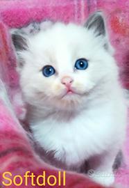 Disponibili cuccioli di razza Ragdoll presso allevamento SOFTDOLL di Lugo di Ravenna, nati il 12 aprile e pronti a lasciare la mamma a inizio luglio. Non facciamo uso di gabbie ma tutti i nostri adulti e cuccioli vivono a stretto contatto con noi nel quotidiano per sviluppare al meglio il carattere tipico della razza, che lo ha reso famoso in tutto il mondo. In ogni Cucciolata saremo in grado di stabilire il cucciolo che ha una dote in più, con attitudine alla PET -therapy. Tutti i nostri cuccioli verranno rilasciati sempre con pedigree ENFI riconosciuto dallo stato italiano e sul quale vengono riportati i test che svolgiamo sui genitori. Inoltre rilasciamo il passaggio di proprietà e contratto di cessione cucciolo. Tutti i nostri cuccioli sono in possesso del proprio libretto sanitario dove troverete annotate le doppie vaccinazioni trivalenti effettuate ed i due trattamenti vermifughi eseguiti, in più svolgiamo il test della giardia sulle feci. Ogni nostro cucciolo avrà sempre graditissimi omaggi, 1 kit della Royal Canin 1 trasportino grande con all'interno un cuscino una copertina e giochini vari. Per maggiori informazioni chiamare al 320 62 51 841. Il prezzo è da riferirsi ad un cucciolo da Pet vale a dire con obbligo di sterilizzazione a circa un anno di età, come da nostro contratto.