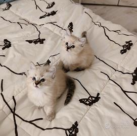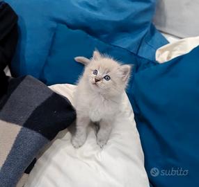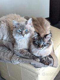 Disponibili da subito due bellissime micette Ragdoll. Genitori sempre vissuti in casa con noi. Hanno un carattere meraviglioso e dolcissimo essendo tra le razze più docili e coccolone esistenti al mondo. Adatti quindi a bambini e pet-terapy. No pedigree. Verranno cedute sverminate e abituate all'uso della lettiera e tiragraffi Se volete venire a vederle non esitate a contattarmi. Pallino il papà è un Blue Mitted Colorpoint Pukka la mamma è una Tabby Seal Chocolate come da foto. Daniele