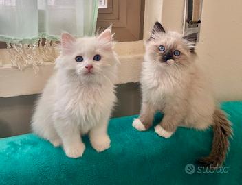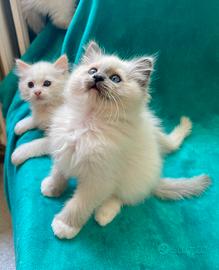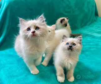 Disponibili bellissimi e dolcissimi cuccioli di Ragdoll. Nati 18.02.26. Sono due femmine e sei maschi. Carattere superlativo. Nati e cresciuti liberi in casa, in ambiente familiare. Manipolati sin dal primo giorno, hanno un imprinting curatissimo. Saranno ceduti svezzati, sverminati, trattati con antiparassitario, abituati all'utilizzo della lettiera e del tiragraffi, con certificato di buona salute, libretto sanitario del veterinario, vaccino trivalente. Mamma Ragdoll e Papà Ragdoll, entrambi dotati di pedigree di altissima genealogia. Esenti da malattie genetiche, FIV e FELV e HCM negativi. Solo per veri amanti degli animali. Possibilità di vederli dal vivo previo appuntamento