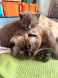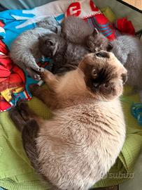 ?Cuccioli Scottish Fold e Straight disponibili Disponibili 4 splendidi gattini di razza Scottish (Fold e Straight), cresciuti in ambiente familiare con amore e attenzione. Età: nati il 01/03 Tipologia: Scottish Fold (orecchie piegate) e Scottish Straight (orecchie dritte) Colori: Due grigi Fold ( maschio e femmina) uno maschio nero e una femmina cioccolato Straight Carattere: dolci, affettuosi, abituati al contatto umano e ai bambini Già svezzati Abituati alla lettiera Visita veterinaria e prima vaccinazione Genitori visibili in casa con noi Perfetti per compagnia, ideali anche per famiglie con bambini. Per maggiori informazioni, foto o per venirli a conoscere, contattami in privato. Solo per persone serie e amanti degli animali