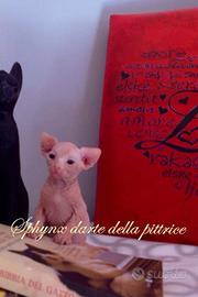 BUONGIORNO vorrei innanzitutto presentarmi mi chiamo FORTUNATA CARTA sono un allevatrice riconosciuta ANFI ..... iCuccioli sono molto socievoli e adatti alla convivenza con bimbi piccoli e altre razze sia di cane che di gatto ..... se mi chiami ti racconto diverse esperienze che ti lasciano a bocca aperta ... i cuccioli sono regolarmente denunciati e hanno pedigree ANFI lo Sphynx è una razza naturale è non necessita di particolari cure .....tra l'altro sono adatti alla Pet terapy i miei soggetti vengono a contatto con i bimbi con problematiche .. i miei soggetti inoltre praticano la musicoterapia e l'aroma terapia...Immagina quanto sono dolci e amabili .Ogni cucciolo verrà ceduto a 3 mesi di età .... verrà inoltre consegnato: *cartelle sanitarie dei genitori e nonni .Testati annualmente per Fiv e felv e hcm da un medico specialista *2 vaccini polivalenti per l'anno 2026/2027 microchip +inserimento nella banca dati felina nazionale e mondiale * inoltre per il bene del piccolo viene donato: SCORTA DI CIBO ROYAL KITTEN PER UN ANNO..... copertina psicologica .....giochini aventi odore della mamma e dei fratellini per aiutare l'inserimento nella nuova famiglia .... io personalmente rimarrò a disposizione sia nell' inserimento che dopo... PS Ti informo che ogni piccolo sarà contraddistinto da collarini colorati non ci si può sbagliare una volta che avete effettuato la vostra scelta.Per il prezzo preferisco parlarne per telefono in modo di fare anche la vostra conoscenza Il mio cell: 3470175067... Questo è un nido d'amore quindi per il bene dei nuovi nati non vengono praticati accoppiamenti inter parentali ... È la prima cosa che mi sta a cuore e la salute del cucciolo... Contattatemi anche senza impegno, anche solo per fare una chiacchierata......