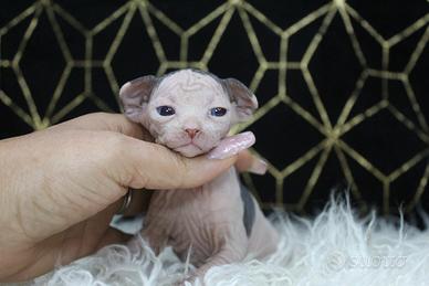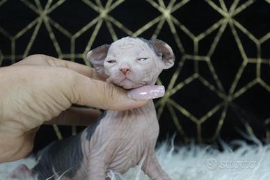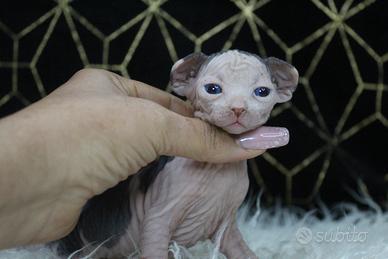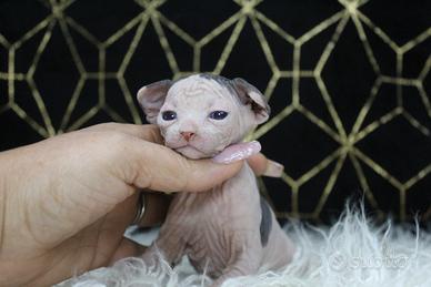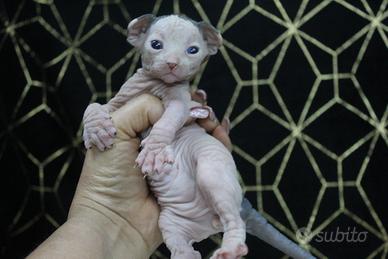 Solo per intenditori della razza , cucciolo disponibile con pedegree Canadian sphynx con gene dbe program occhi azzurri ho impari nato 15 giorni fa disponibile fine giugno inizio luglio , questo cucciolo non è cucciolo comune o come quelli che vedete in tutti gli allevamenti italiani.Quindi astenersi scucciolatori ho perditempo , sono cuccioli che avranno occhi azzurri o impari in una colorazione di manto bicolore , nero e chocolato ect. manti solidi dove normalmente sarebbero verdi o Gialli , in Italia siamo due / tre ad avere DBE program quindi pochi confronti ai gatti normali , genitori negativi hcm filv felv , saranno consegnati vaccinati, sverminati profilassi completa ceduti 90 giorni di età per Maggiori informazioni non esitate ha contattarmi.