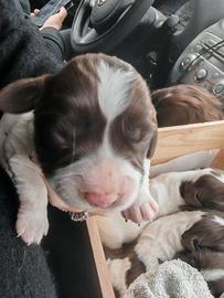 Siamo 5 cuccioli di Springer Spaniel inglese, 3 maschi e 2 femmine. I nostri genitori sono visibili, ottimi cacciatori ed hanno pedigree. Anche noi lo avremo al momento della cessione, insieme al primo vaccino. Siamo nati il 3 febbraio e potremmo venire affidati non prima dei 60 giorni. Abbiamo un'ottima attitudine al lavoro e riporto, ma volendo siamo anche ottimi cani da compagnia per grandi e piccini, perché vivaci, ma obbedienti. Se interessati contattate e venite a conoscerci.