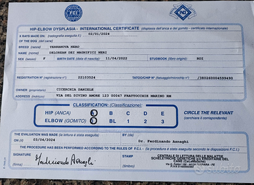 Disponibili i link ai pedigree con informazioni sanitarie e genetiche. Genitori testati ed esenti da patologie genetiche della razza. Disponibili le lastre e referti che attestano l`assenza di displasia agli arti e ad altre patologie