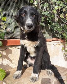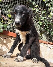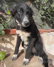 Elvis, maschio, 4 mesi, mix border collie, nero con pettorina bianca, futura taglia medio grande, indole docile. Ha vaccini e microchip e gode di ottima salute.