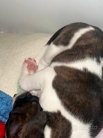 Cucciola femmina amstaff 60 giorni compiuti sverminato e svezzato fa i bisogni già nella traversa bianco brindle occhi blu abituata al contatto umano cresciuta in ambiente familiare cerco una famiglia responsabile. no perditempo numero info 3492107347