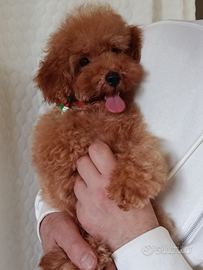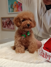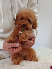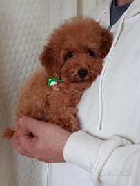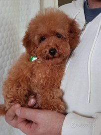 Milo è un meraviglioso cucciolotto di barboncino fulvo albicocca di circa 4 mesi e mezzo d'età, futuro toy; misura infatti 19 cm al garrese per circa 2,300 kg di peso. Prevediamo per lui altezza da adulto di 24/25 cm.