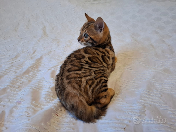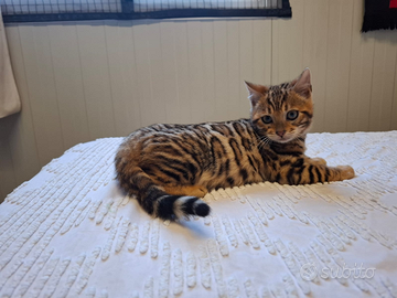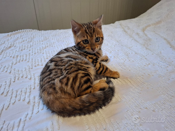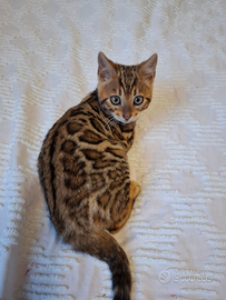Cucciolo bengala maschio disponibile da subito. Si consegna sverminato, ciclo vaccinale completo, microchippato. Pedigree ANFI da compagnia, con possibilità di pedigree da riproduzione ad un prezzo diverso. Padre testato per le malattie genetiche pra-b e pk-def, cuore controllato con ecocardio. Mamma nata da noi. Per l invio di foto e video contattatemi al 3793130315