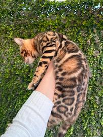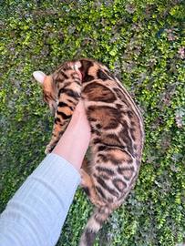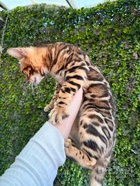 Adorabile cucciolo di 5 mesi di pura razza bengala di alta genealogia di colorazione classica Brown spotted tabby , con un bellissimo mantello setoso lucido e brillante , mantello Leopardato con le rosette grandi , sarà un po più grande e più lunga di un classico gatto domestico, stupendo musetto di un felino, ma con un stradolcissimo carattere giocoso, vivace, curioso , ama l'acqua , adora giocare con i bambini ! Oltre questo la nostra splendore è anche di un ottimo salute con i genitori testati fiv e felv negativi , esenti delle malattie ereditarie HCM , PKD, PK-Def, PRA-b . Cucciolino è tanto tranquillo ma allo stesso tempo giocherellone e vivace , non è aggressivo , abituato alla lettiera e tiragraffi . Si cede con Il libretto sanitario con i vaccini e sverminazioni, svezzato regolarmente.
