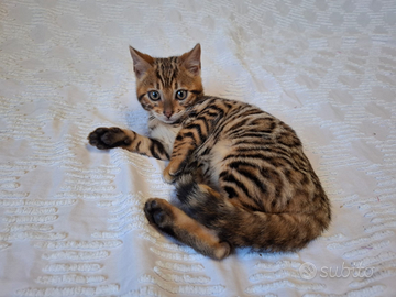 Cucciolo bengala maschio disponibile da subito. Si consegna sverminato, ciclo vaccinale completo, microchippato. Pedigree ANFI da compagnia, con possibilità di pedigree da riproduzione ad un prezzo diverso. Padre testato per le malattie genetiche pra-b e pk-def, cuore controllato con ecocardio. Mamma nata da noi. Per l invio di foto e video contattatemi al 3793130315
