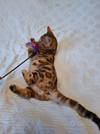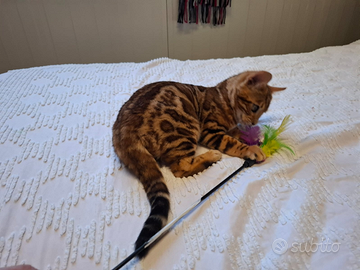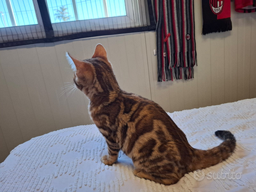 Cucciolo bengala disponibile da subito. Si cede sverminato, ciclo vaccinale completo, microchippato. Pedigree ANFI da compagnia, con possibilità di pedigree da riproduzione ad un prezzo diverso. Padre testato per le malattie genetiche pra-b e pk-def, cuore controllato con ecocardio. Mamma controllata anch'essa. Per maggiori informazioni, per l invio di foto e video contattatemi al 3793130315