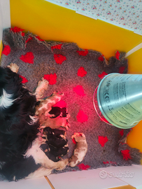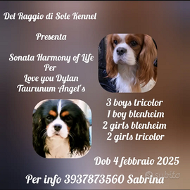 Due cuccioli di cavalier king sono disponibili. Sono due dolcissimi maschietti,uno blenheim ed uno tricolor. Saranno disponibili a metà aprile con pedigree, iscrizione anagrafe canina,microcip, vaccinazioni, sverminazioni, certificato di buona salute, copie test genitori per occhi cuore rotule e genetici,kit cucciolo. Vivono con noi in famiglia, e, previo appuntamento è possibile venire a trovarci per vederli. Ci fa molto piacere accogliervi.