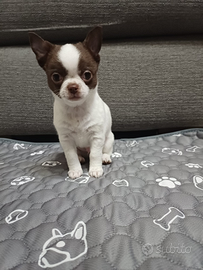 Bellissimo maschietto di chihuahua taglia piccolissima color cioccolato e bianco disponibile da fine febbraio, verrà ceduto con pedigree enci, vaccino, microchip e visita veterinaria.