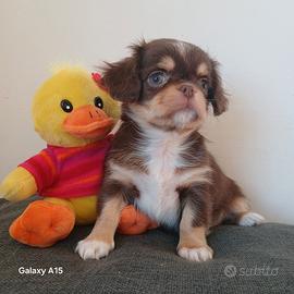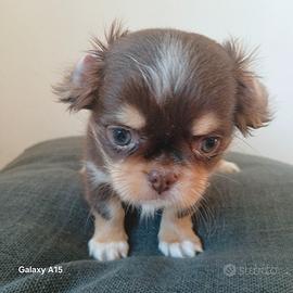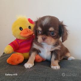 Cucciolo di chihuahua a pelo lungo cioccolato tricolore, figlio di entrambi genitori con DNA depositato. Nato il 29 gennaio e quasi pronto per conoscere la sua nuova famiglia. Abituato ai bambini, ai rumori e alla traversina. Vivace, ma non esagitato. Muso corto, testicoli in sede e morbidissimo. Verrà ceduto con pedigree, microchip e vaccini adeguati all'età. Se desiderate qualsiasi informazione, contattatemi, ma solo se realmente interessati e sarò felice di darvi tutte le informazioni. Chiamatemi o contattatemi via whatsapp al 338 3734718