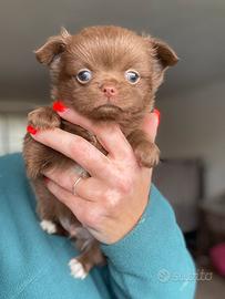 Cediamo cucciolo di chihuahua a pelo lungo color cioccolato completo di vaccini, microchip, sverminazione e antiparassitario disponibile dai primi di aprile. Genitori visibili, papà con pedigree mamma no. NO PEDIGREE. Prezzo 600 euro.