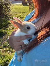 Cucciolo coniglio nano comune , bianco pezzato beige sesso da definire. Genitori visibili in allevamento