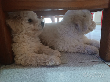 Disponibili cuccioli di barboncino piccola taglia Genitori bianchi Toy e nano Disponibili maschio e femmina Nati il 7 aprile, già svezzati e abituati alla traversa Maschio 600€ Femmina 750€