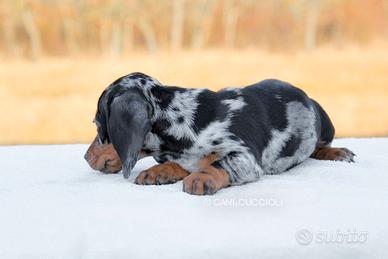 Prontissimo per andare a vivere con una nuova famiglia questo straordinario Bassotto arlecchino. Si chiama Maccio (nome indicativo), il vero boss della sua cucciolata. Maschietto di 2 mesi di età, è un irresistibile e instancabile giocherellone, sempre pronto a divertirsi.