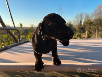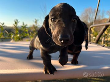 Cucciolo di bassotto nano maschio, di colore nero solido, nato il 10/10/2025. Sverminato, con due vaccini e microchip.