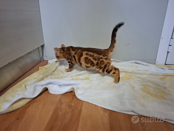 Cucciolo bengala disponibile da subito. Si cede sverminato, ciclo vaccinale completo, microchippato. Pedigree ANFI da compagnia, con possibilità di pedigree da riproduzione ad un prezzo diverso. Padre testato per le malattie genetiche pra-b e pk-def, cuore controllato con ecocardio. Mamma controllata anch'essa. Per maggiori informazioni, per l invio di foto e video contattatemi al 3793130315