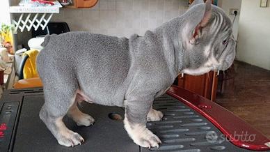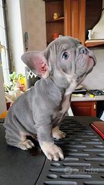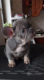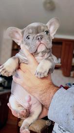 Disponibile splendido cucciolo di Bulldog Francese Esotico nella colorazione Lilac Tan Tricolor: ha un mantello chiarissimo, una bellissima cravattina bianca e gli occhi azzurri come il cielo!